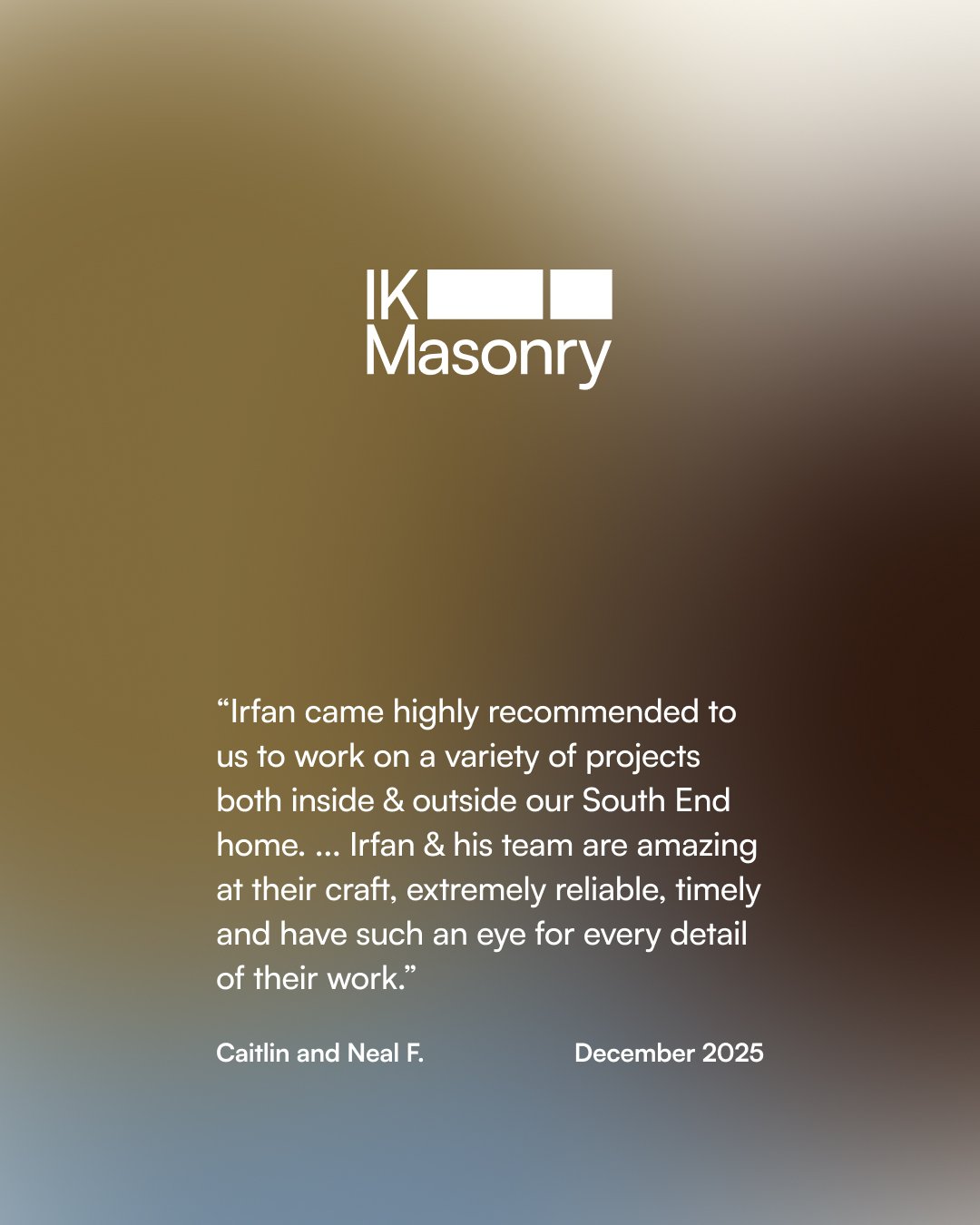 “Irfan is an incredible business owner and his company, IK Masonry is the go-to for all services related to stone walls, brick patios, and chimneys.”