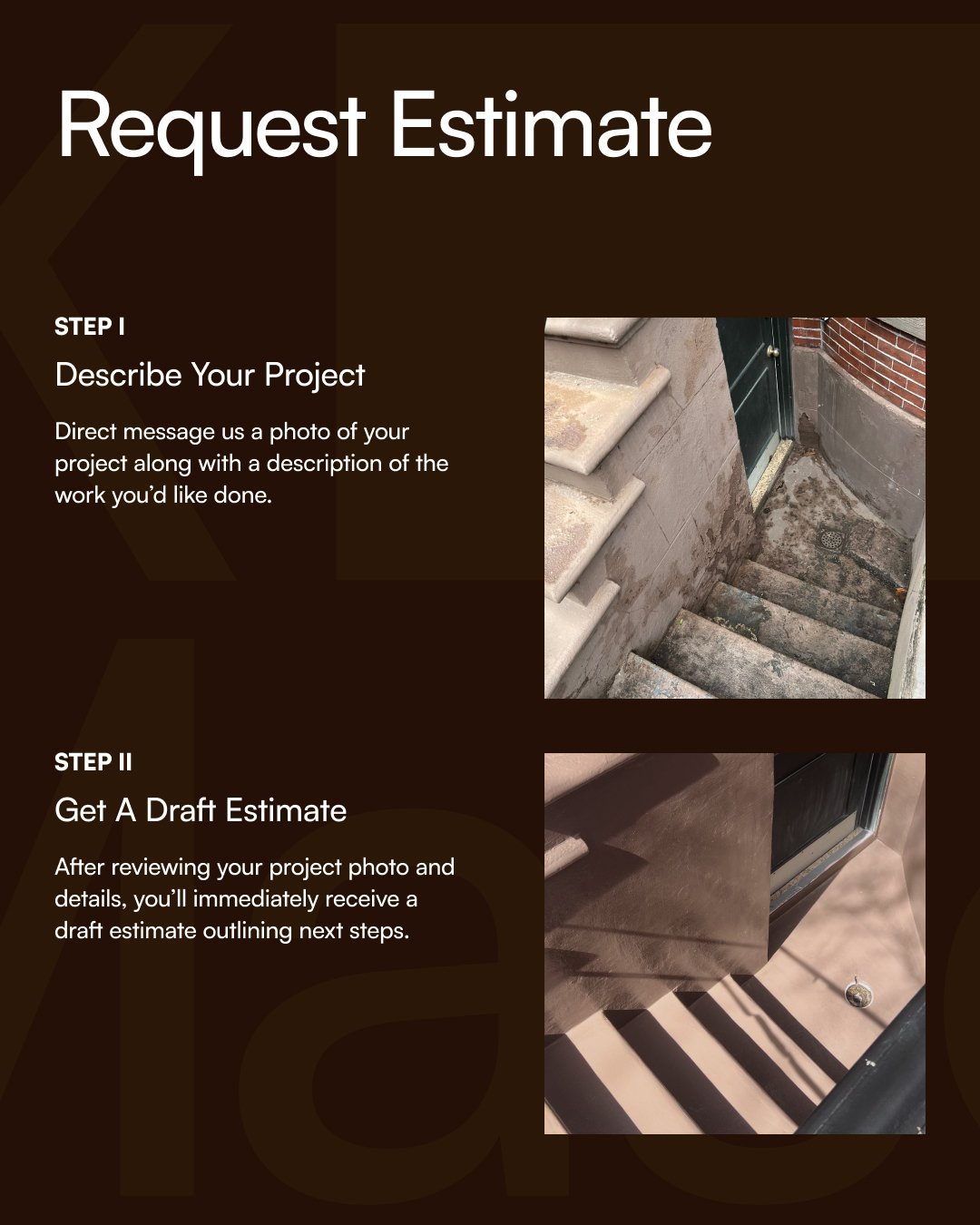 Send us a photo of your project with a short description of the work you would like completed. We will review the details and provide a draft estimate with next steps.